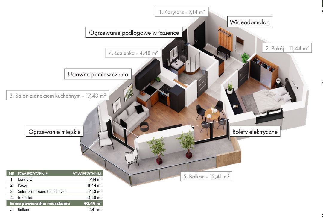 Powierzchnia mieszkania to 40,49m2, na obecny układ pomieszczeń składa się: