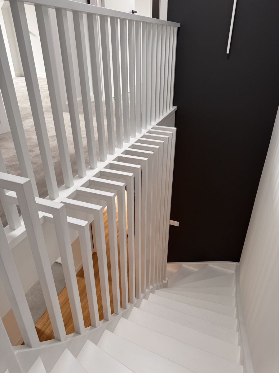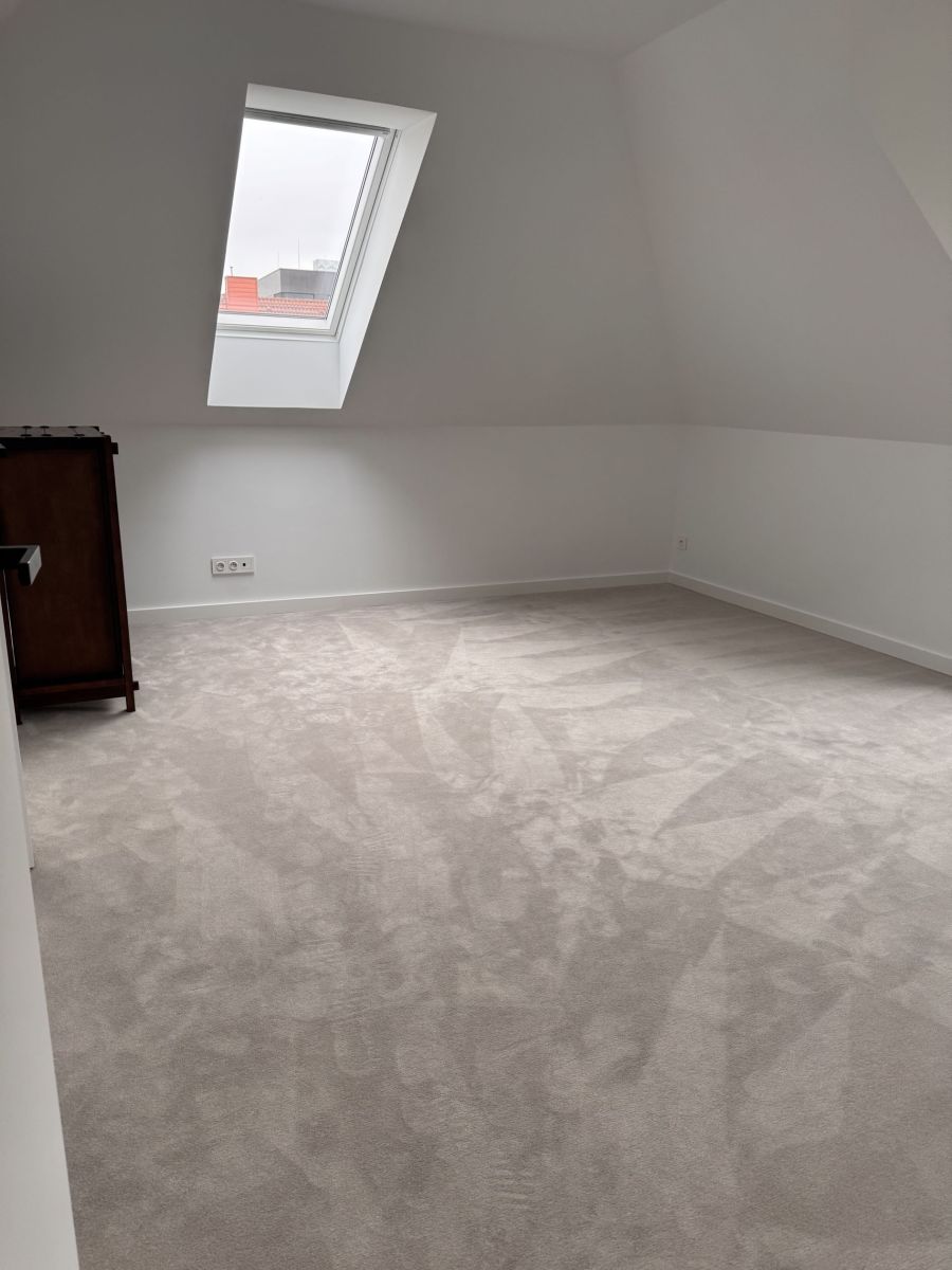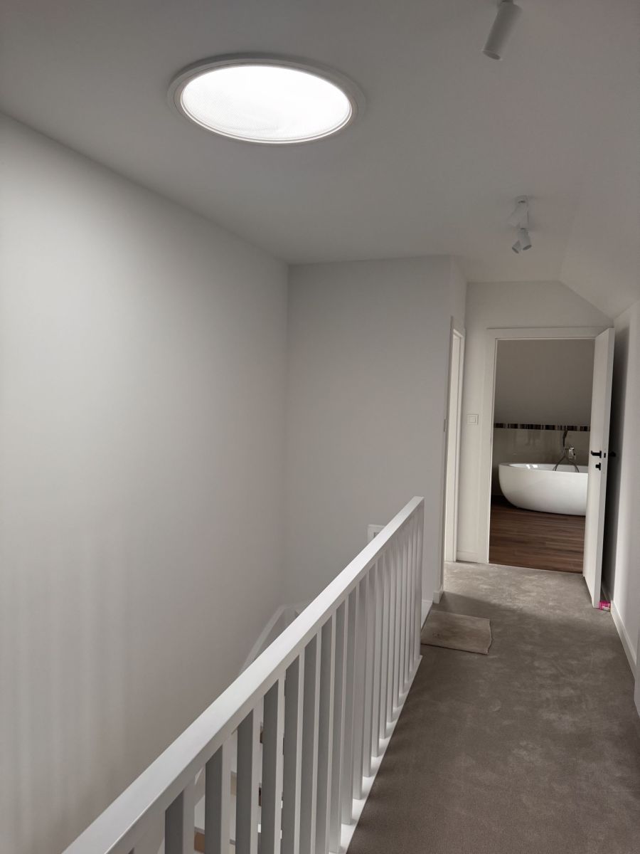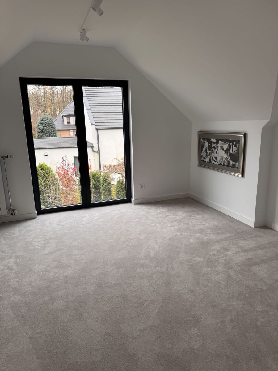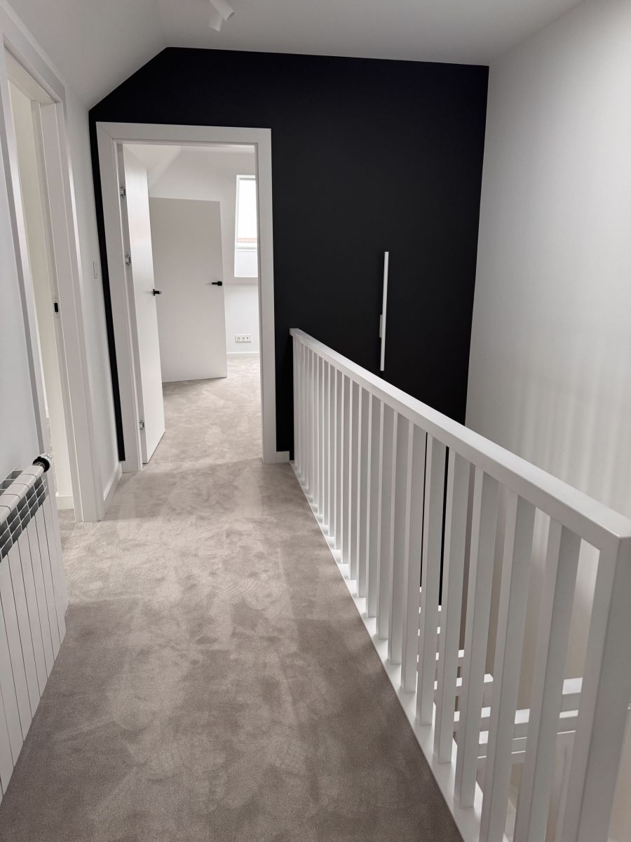 Wymieniona została konstrukcja okien na aluminiowe i nowe drzwi wejściowe wszystko w kolorze antracyt. Zamontowano nową bramę garażową, podbitkę i rynny. Dach pokryty jest ceramiczną dachówką, co gwarantuje trwałość i estetykę na lata. Całość doświetlają nowoczesne oświetlenia, a drewniane schody dodają wnętrzu elegancji. Poddasze wykończono luksusową wykładziną dywanową, tworząc przytulne przestrzenie do wypoczynku.