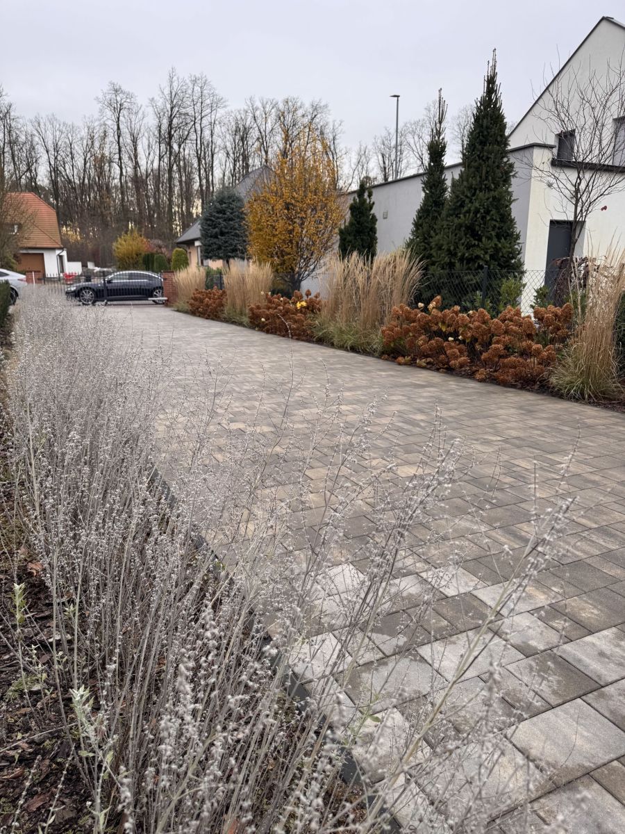 - podjazd wyłożony kostką, podobnie wejście do domu i taras,
