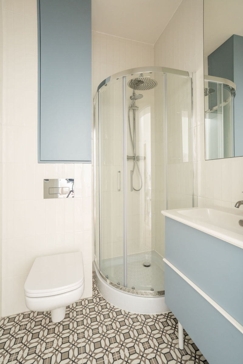 - Łazienka wykończona w wysokim standardzie: półokrągła kabina prysznicowa z deszczownicą, podwieszana toaleta, umywalka z szafką, duża szafa z miejscem na pralkę i detergenty, a także elektryczny podgrzewacz wody.