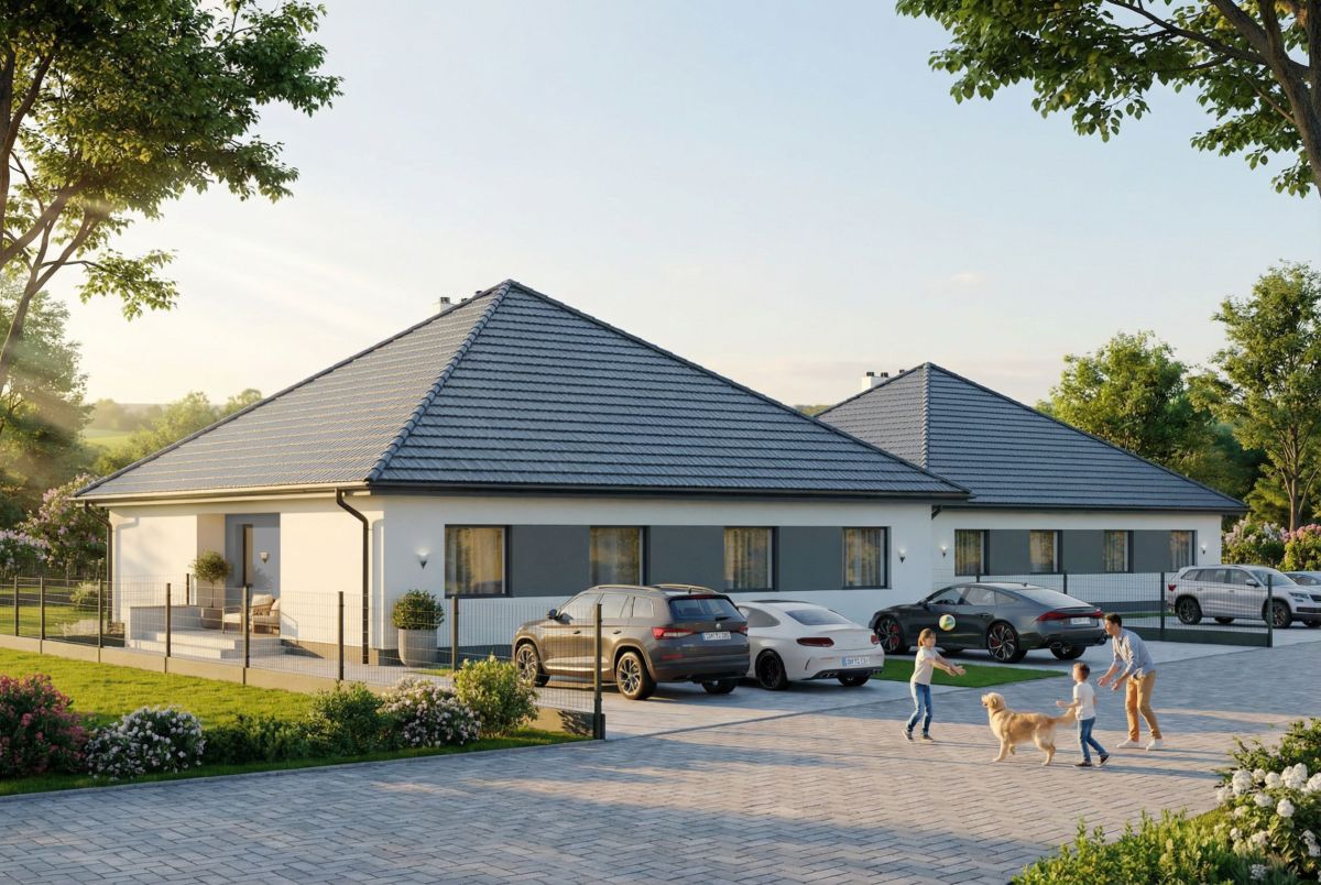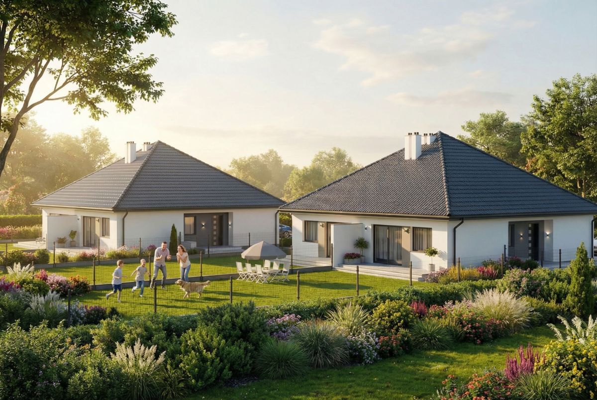 Inwestycja obejmuje dwa parterowe bliźniaki, które powstają w cichej, zielonej okolicy, jednocześnie z szybkim dostępem do centrum miasta.